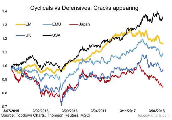 As Chart 3 below demonstrates, Defensive sectors have been doing well relative to Cyclicals in many parts of the world.